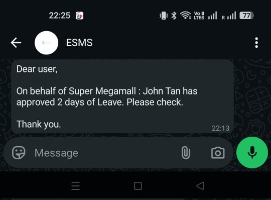 | message | String | A short description of given status, for more information you may contact our support team at support@esms.com.my |